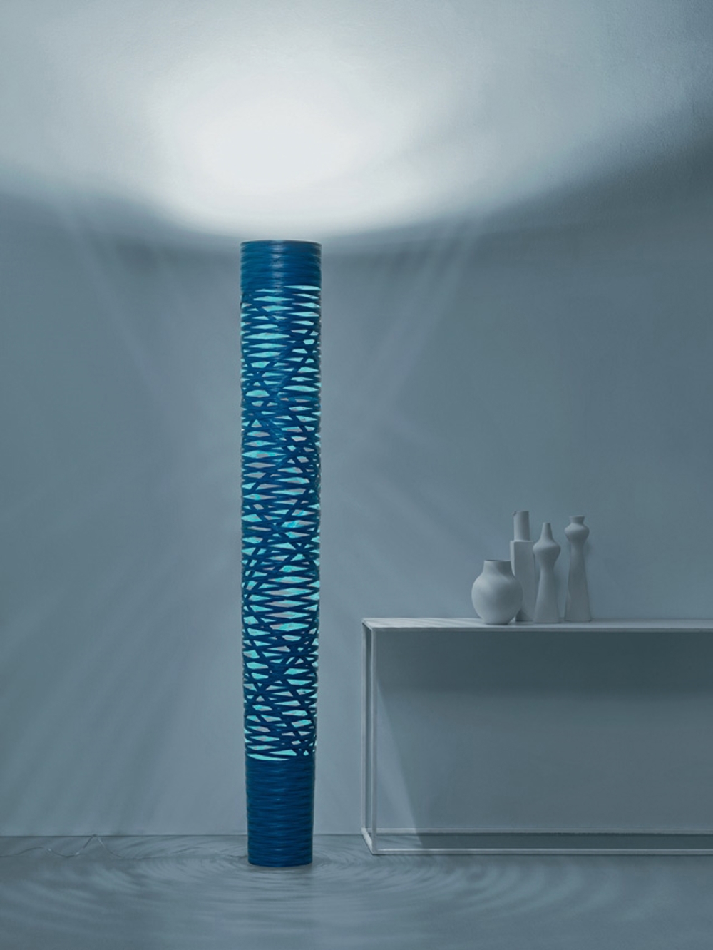 Det karakteristiske på Tress lampen er det flettede materiale, der omgiver sig lampen, bestående af glasfiber og vævet harpiksbånd.