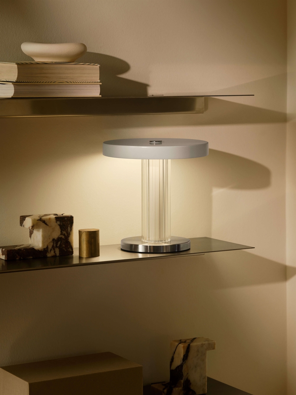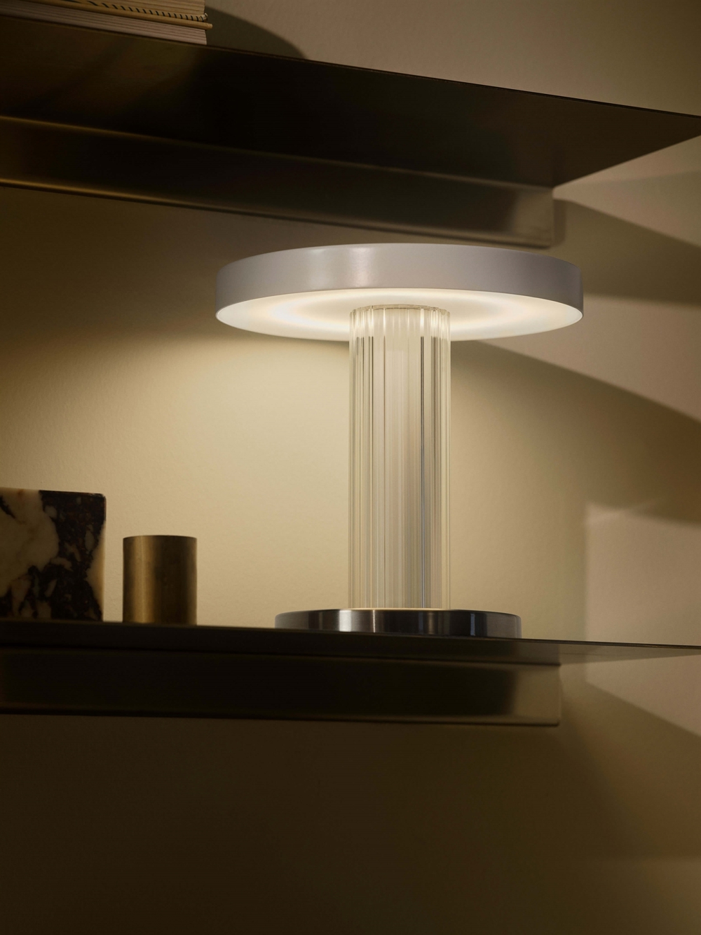 Den genopladelige batterilampe Trezzi Portable er dansk design med et moderne og elegant udtryk. Det riflede glas er inspireret af vintage Art Deco og er smukt kombineret med en stabil base i rustfrit stål og hvid metalskærm.