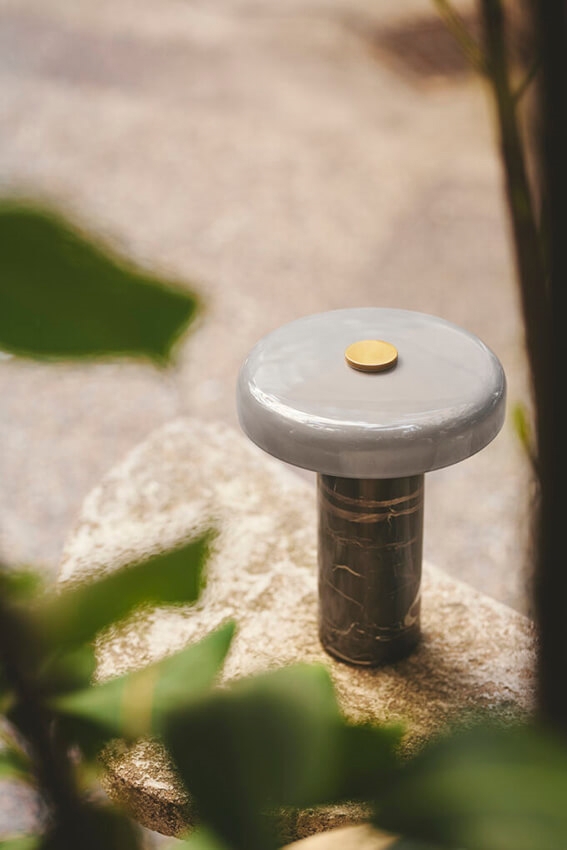TRIP-serien består af lamper med en smuk base af marmor, en mundblæst glasskærm og messingdetaljer.