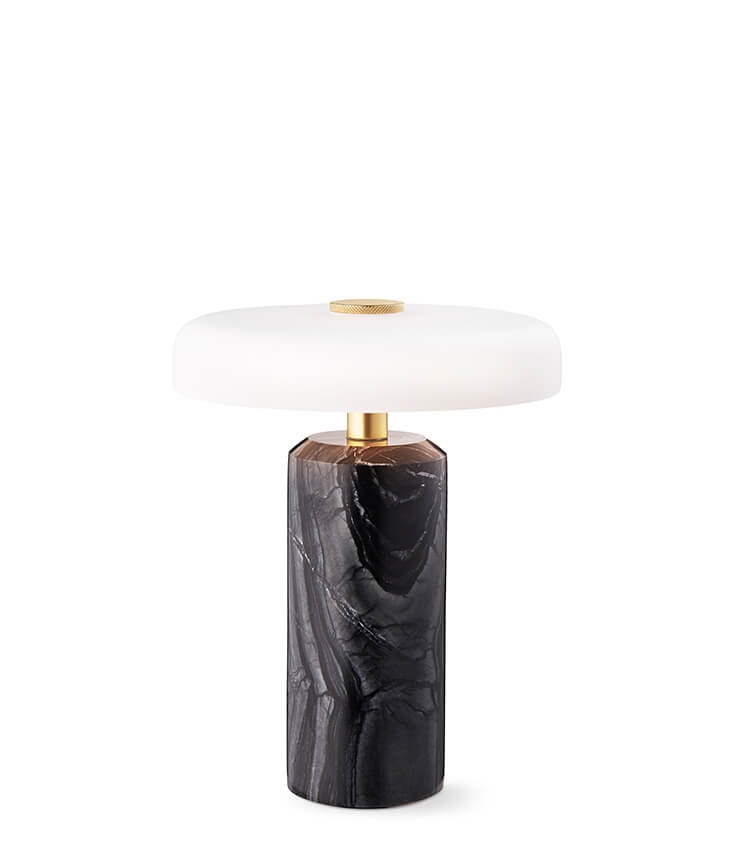 TRIP-serien består af lamper med en smuk base af marmor, en mundblæst glasskærm og messingdetaljer.