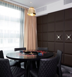 Valentine serien består af to størrelser pendler og en bordlampe i sølv, guld og sort.