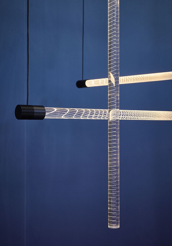 Pendlen består af et LED-rør lavet af ætset glas, der får lyset til at blive brudt flot i rummet.