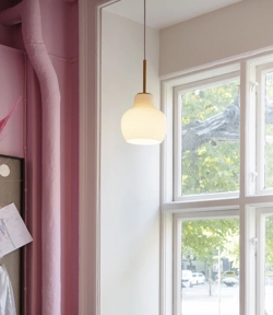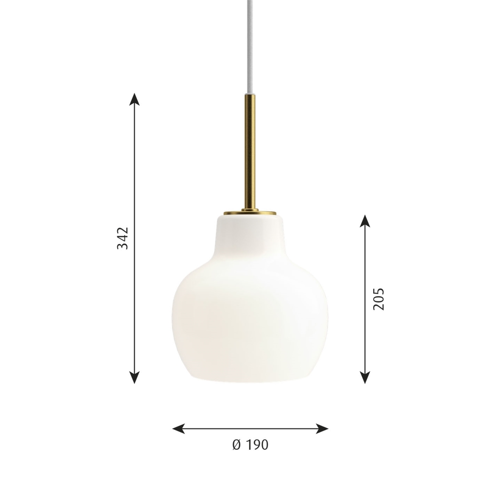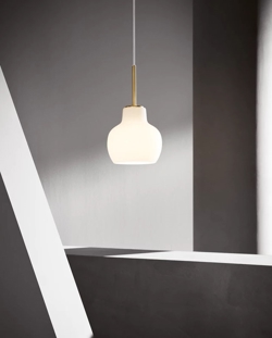 VL Ringkrone afgiver et behageligt og varmt lys, der vil passe ind i enhver indretning. Skærmen er af mundblæst opal trelagsglas med ophæng og baldakin i ubehandlet poleret messing, som kommer til at patinere. Pendlerne findes med en, tre, fem eller syv skærme.