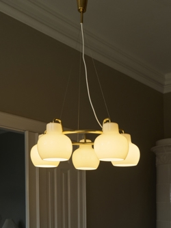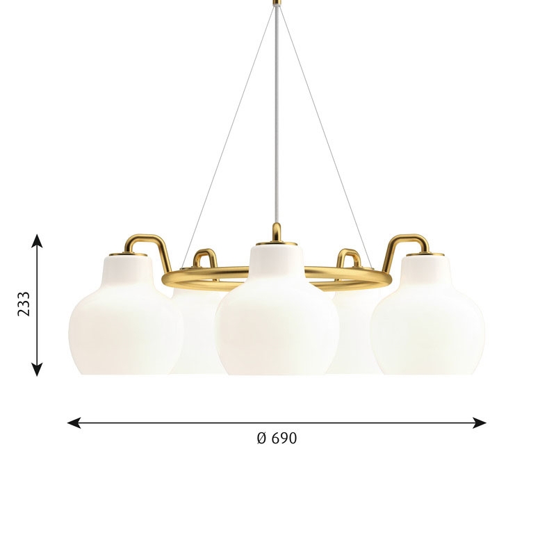 VL Ringkrone afgiver et behageligt og varmt lys, der vil passe ind i enhver indretning. Skærmene er af mundblæst opal trelagsglas med ophæng og baldakin i ubehandlet poleret messing, som kommer til at patinere. Pendlerne findes med en, tre, fem eller syv skærme.