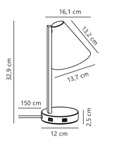 Mål: H32,9 x D16,1 cm, skærm: Ø13,7 x H13,2 cm, base Ø12 cm