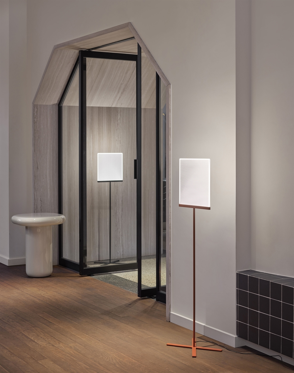 Coveret til skærmen er kvadratisk og findes i fire forskellige farver - hvid, antrasit, pebbles/kiselgrå og rust. Basen findes i farverne antrasit, pebbles/kiselgrå og rust.